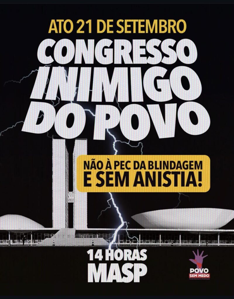 A aprovação da PEC da Blindagem não passará despercebida. Em resposta a essa manobra, diversos movimentos sociais, centrais sindicais, artistas e intelectuais estão convocando atos para o próximo domingo, 21 de setembro.
