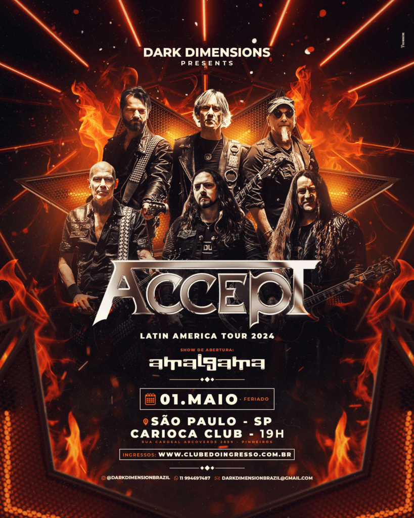 Com uma carreira notável que abrange mais de quatro décadas, o ACCEPT emergiu na cena musical nos anos 70 e rapidamente se tornou um ícone do heavy metal mundial com seu som pesado, clássico e vibrante. Conhecidos por hinos atemporais como “Breaker”, “Balls to the Wall”, “Metal Heart”, “Fast As A Shark”, “Princess Of The Dawn” dentre muitos hinos atemporais do heavy metal, a banda estabeleceu um padrão de excelência que influenciou muitas gerações de músicos.