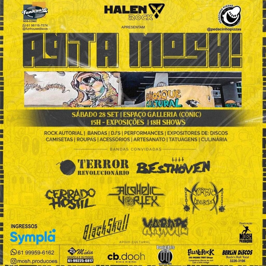 Trata-se do ‘AGITA Mosh!’, que acontecerá no próximo sábado (28/09) no Espaço Galleria – Centro Comercial Boulevard (Conic), em Brasília. O evento contará também com nomes como Besthöven, Terror Revolucionário, Cerrado Hostil, BlackSkull, Xarope e Morbid Devourment, além de diversas outras atrações como DJs, performances, oficinas, workshops e diferentes expositores. Confira abaixo o cartaz e o serviço completo para mais informações: