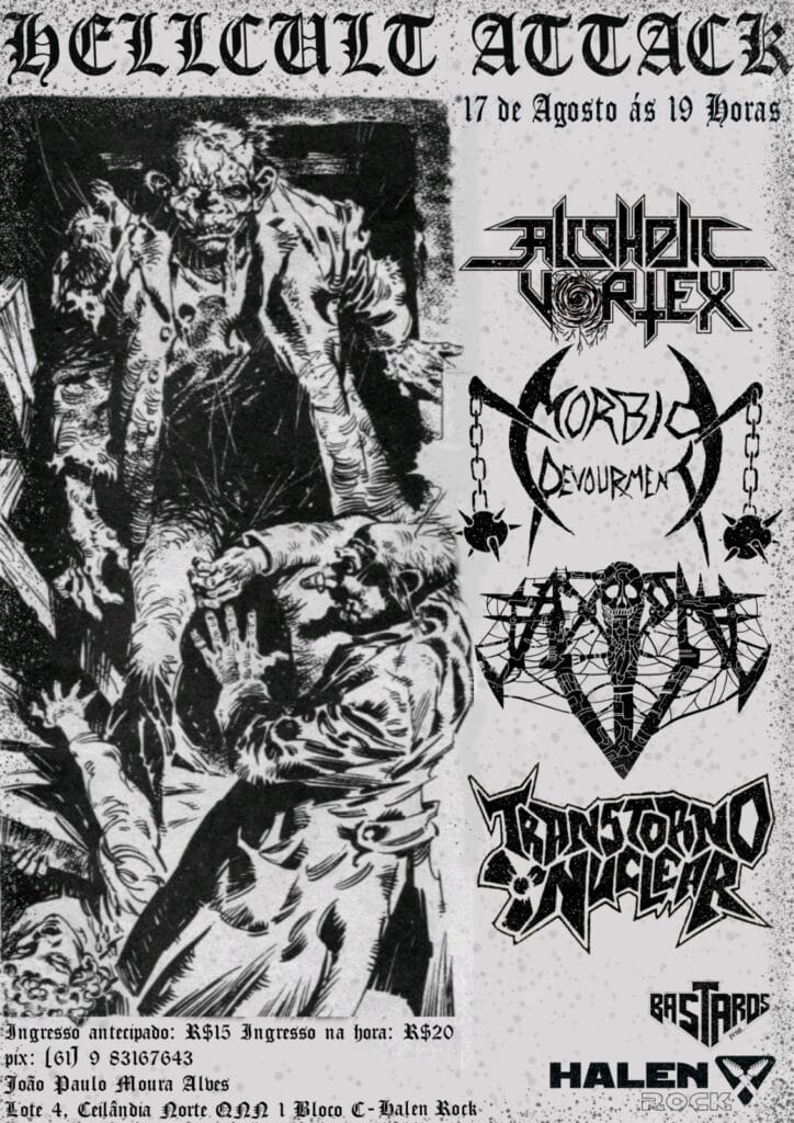 Em outras notícias, o ALCOHOLIC VORTEX confirmou presença, ao lado de Morbid Devourment, Axion e Transtorno Nuclear, no ‘Hellcult Attack’, que acontecerá no dia 17/08 às 19 horas, no Halen Rock em Brasília/DF. Este show marcará o retorno do guitarrista Marc Lizzy aos palcos após um recente acidente. Confira abaixo o cartaz e o serviço completo para mais informações:
