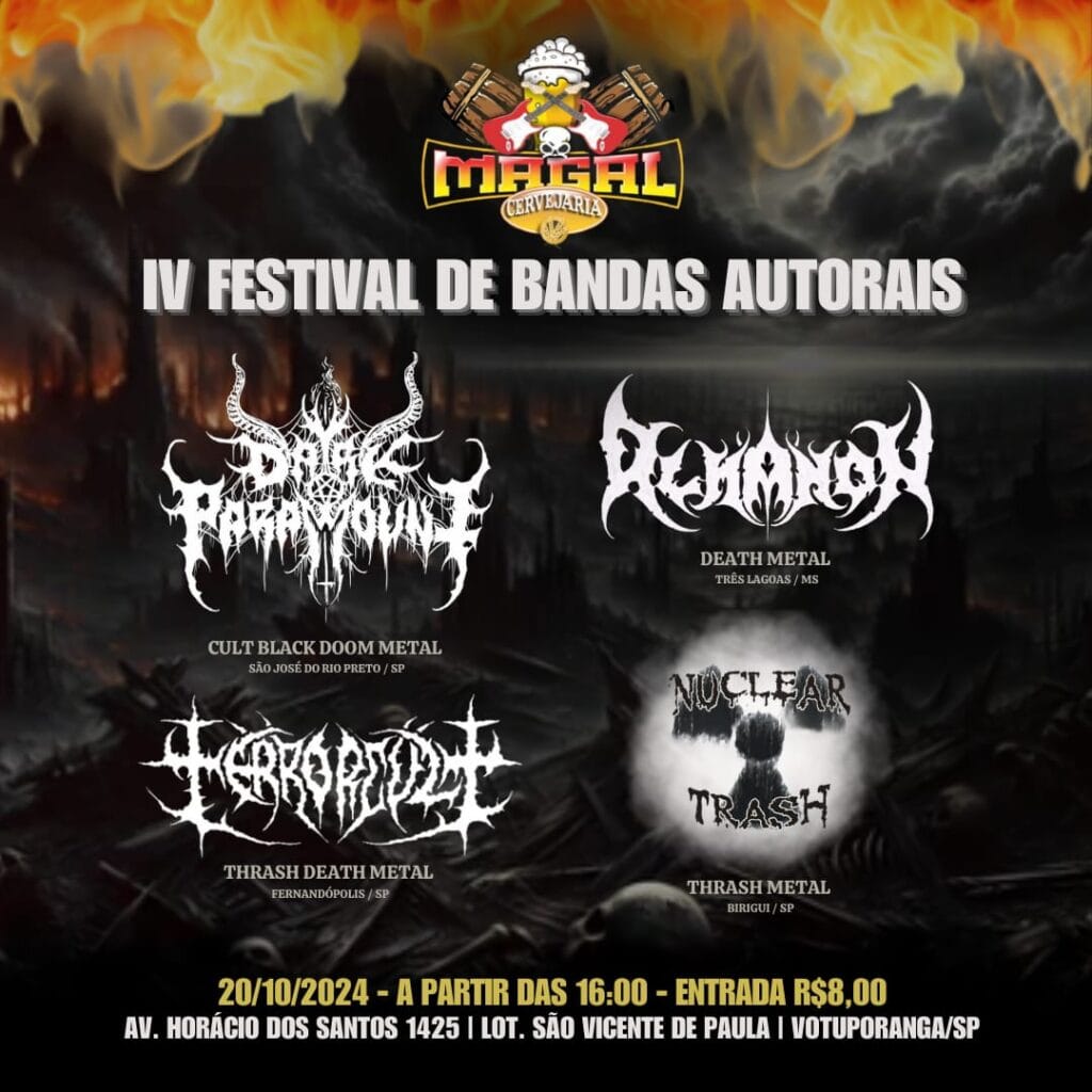 O quarteto estará ao lado de Nuclear Trash, Dark Paramount e Terrorcult na quarta edição do ‘Festival de Bandas Autorais’, acontecerá no próximo domingo (20), a partir das 16 horas, no Magal Cervejaria, em Votuporanga/SP. Confira abaixo o cartaz e serviço completo para mais informações: