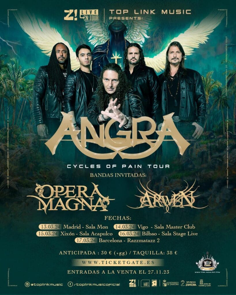 Exatos trinta anos após lançar o álbum de estreia, o antológico Angels Cry, o Angra colocou no mercado seu mais novo disco, Cycles of Pain. O grupo, que iniciou no Brasil a turnê desse trabalho, com apresentações que vem movimentando uma verdadeira legião de fãs, confirmou a primeira série de apresentações na Europa em 2024, com abertura das bandas Opera Magna e Arwen. As datas são as seguintes – até o momento, todas na Espanha: