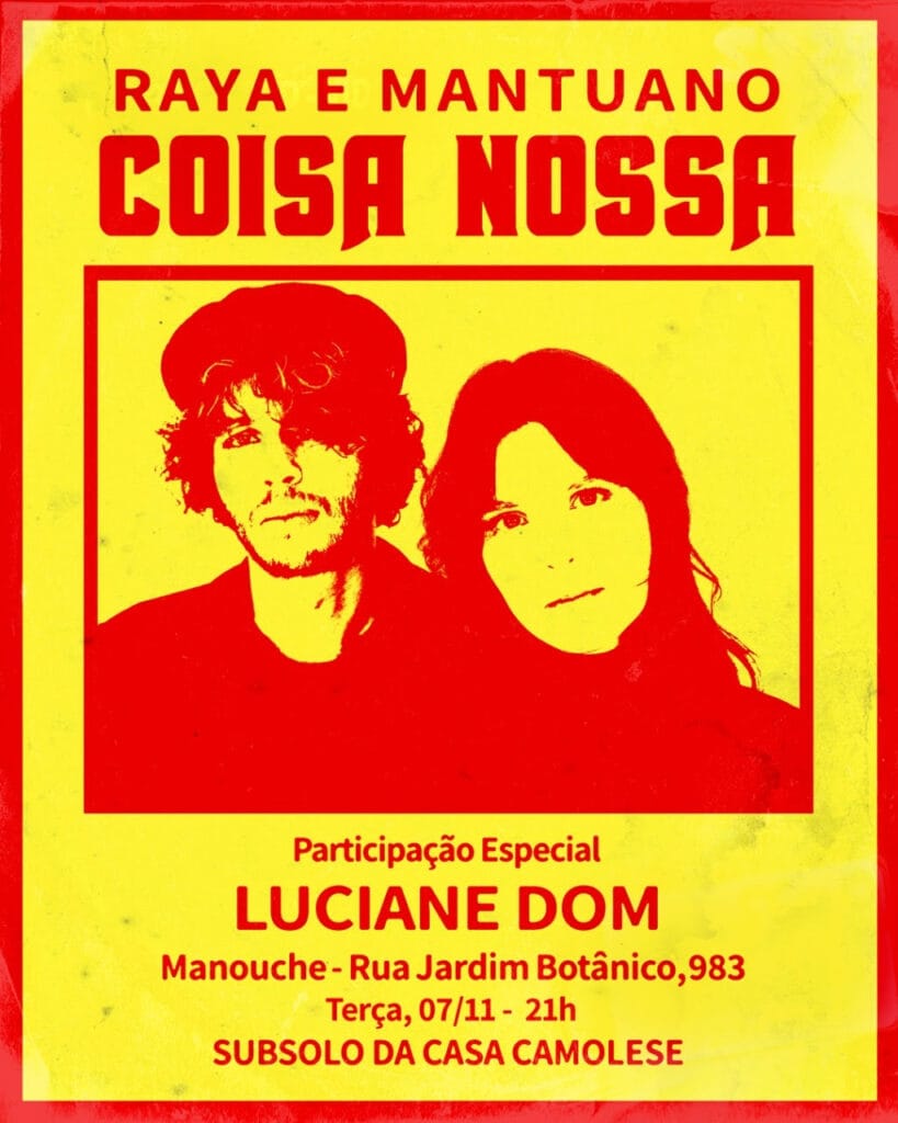 Após esgotar os ingressos e lotar o Manouche, João Mantuano e Paula Raia, dois talentos da nova MPB, retornam à casa de show no Rio de Janeiro no dia 7 de novembro. A dupla, acompanhada de uma banda, apresenta o projeto ‘Coisa Nossa’, álbum de 12 faixas, composto no badalado Estúdio Toca do Bandido, e que terá lançamento em breve pelo selo Toca Discos. O show terá participação especial da cantora e compositora Luciane Dom.