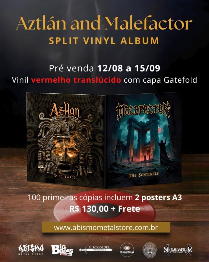 A banda baiana de Death Metal AZTLÁN e a lendária Malefactor anunciaram oficialmente a pré-venda de seu aguardado Split LP. O material, que une os EPs “Xipe Totec” (AZTLÁN) e “The Sentinels” (Malefactor), promete ser um item indispensável para os apreciadores do metal extremo nacional. A pré-venda está disponível entre os dias 12 de agosto e 15 de setembro, através do selo Abismo Metal Store (@abismometalstore).