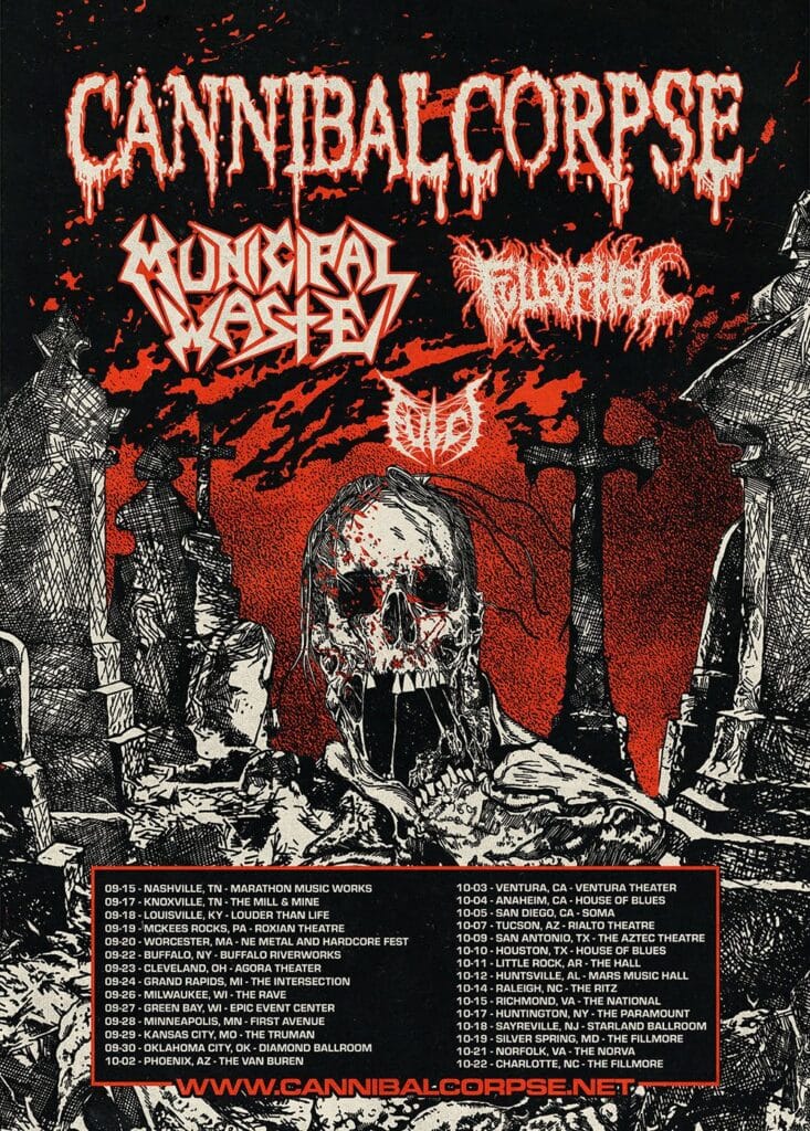 As lendas do death metal CANNIBAL CORPSE têm o prazer de receber o Full Of Hell em sua turnê pelos EUA, previamente anunciada, para este outono. A turnê começa em 15 de setembro em Nashville, Tennessee, e passa por mais de duas dezenas de cidades, terminando em 22 de outubro em Charlotte, Carolina do Norte. A banda Municipal Waste e a Fulci também farão o apoio