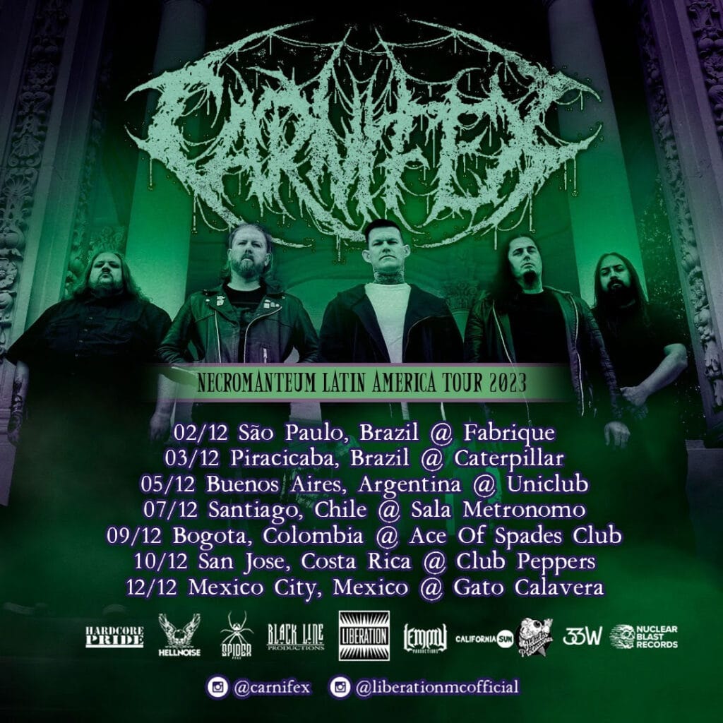 Prestes a lançar o nono álbum de estúdio da carreira, a banda norte-americana Carnifex, referência mundial do gênero deathcore com 18 anos de atividades, confirma a primeira turnê pela América do Sul para dezembro de 2023. São dois shows no Brasil: dia 2/12 em São Paulo (Fabrique Club) e dia 3/12 em Piracicaba (Clube Caterpillar). A turnê é uma realização da Liberation Tour Booking.