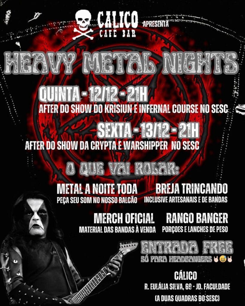 Logo após as apresentações dos dias 12 e 13, o Cálico Café Bar, localizado a duas quadras do Sesc Sorocaba, realizará eventos “after-party” intitulado “Heavy Metal Nights”.