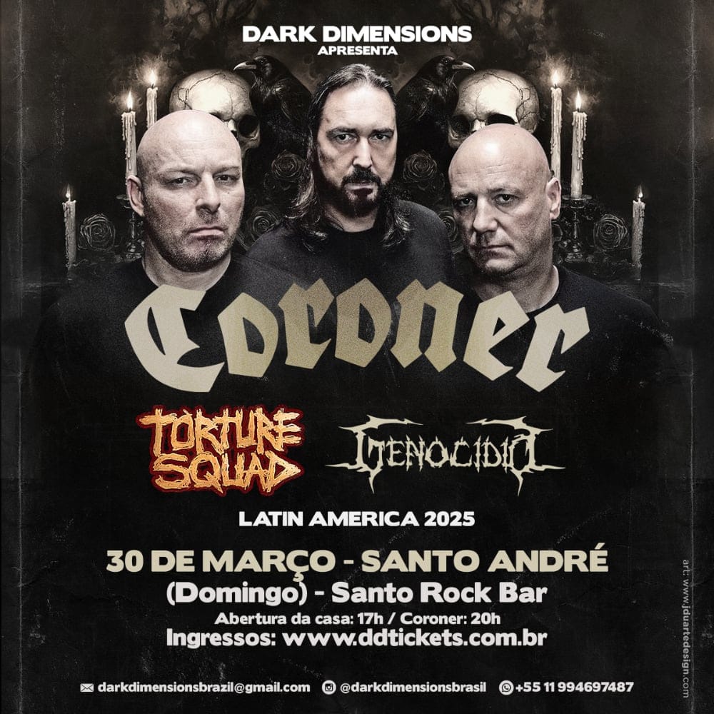 Ícone do Thrash Metal técnico mundial, a lendária banda suíça Coroner embarcará em uma extensa turnê global em 2025 para comemorar suas quatro décadas de carreira. No Brasil, o grupo realizará um show único e exclusivo no dia 30 de março, domingo, no Santo Rock Bar, em Santo André/SP, como parte de uma turnê de seis shows pela América Latina organizada pela produtora Dark Dimensions.