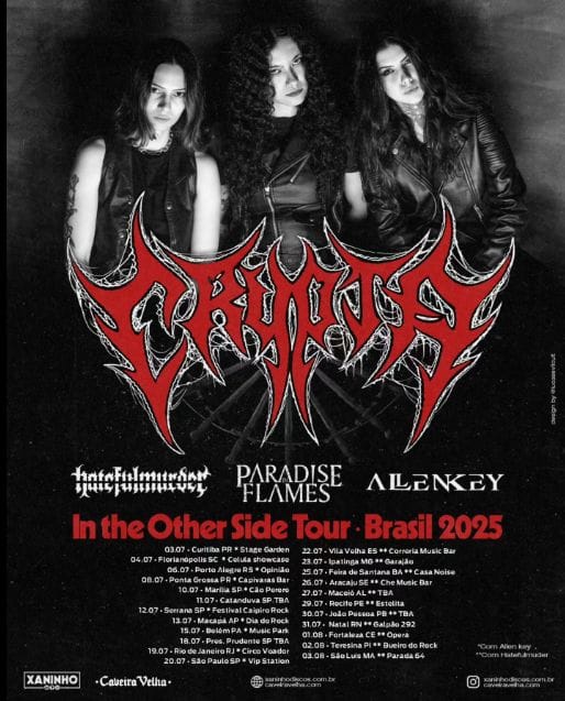 Após encerrar uma bem-sucedida turnê europeia ao lado das bandas Aborted, The Zenith Passage e Organectomy, a banda brasileira Crypta se prepara para uma maratona de 23 apresentações em solo nacional. A “In The Other Side Tour – Brasil 2025” começa no dia 3 de julho, em Curitiba (PR), e segue até 3 de agosto, passando por cidades de norte a sul do país.