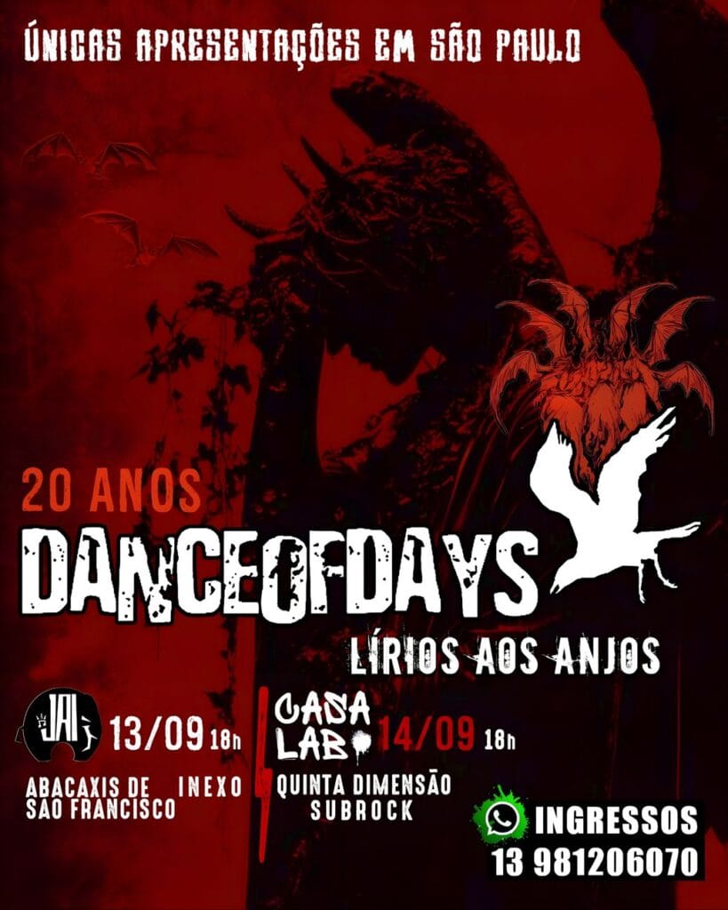 Repetindo o sucesso dos sold outs no Sesc Avenida Paulista no ano passado, a Dance of Days esgotou novamente duas datas nesse final de semana no Sesc 24 de Maio, nas celebrações do Dia do Rock, e já anuncia, para setembro, dois shows especiais na capital, para celebrar os 20 anos do aclamado álbum Lírios Aos Anjos, divisor de águas em sua carreira: dia 13 de setembro (sábado), no Jai Club, e dia 14 de setembro (domingo), na Casa Lab.