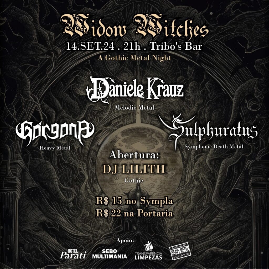 No sábado (14/09), DANIELE KRAUZ se apresentará em Maringá/PR ao lado das bandas Górgona e Sulphuratus no evento ‘Widow Witches – A Gothic Metal Night’, que será realizado no tradicional Tribo’s Bar. O evento, que terá início às 21h, contará com a abertura da DJ Lilith. Confira abaixo o cartaz e o serviço completo para mais informações:
