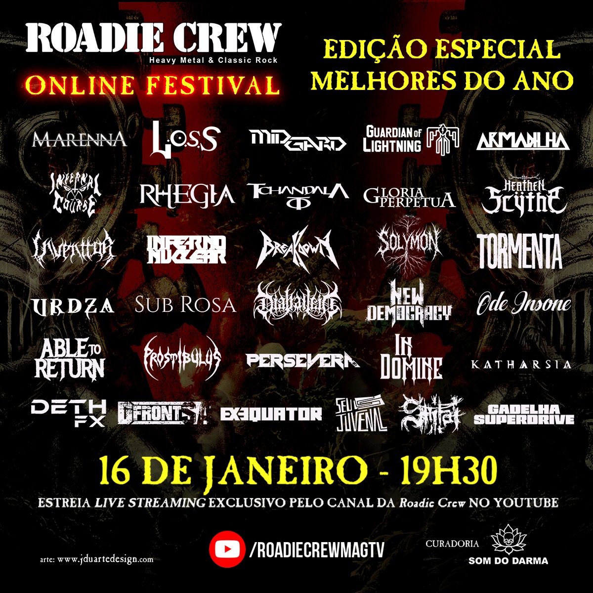O evento, que ocorre nesta sexta-feira, 16 de janeiro de 2026, contará com a exibição do videoclipe da faixa “Eternal Vortex” o DIABÁLLEIN divide o line-up com outros nomes de peso da cena extrema e convencional, como ShitaiProstibulusInferno Nuclear e Inventtor. A transmissão terá início às 19h30, exclusivamente pelo canal oficial da revista Roadie Crew no YouTube. Confira abaixo o cartaz e o serviço completo para mais informações:
