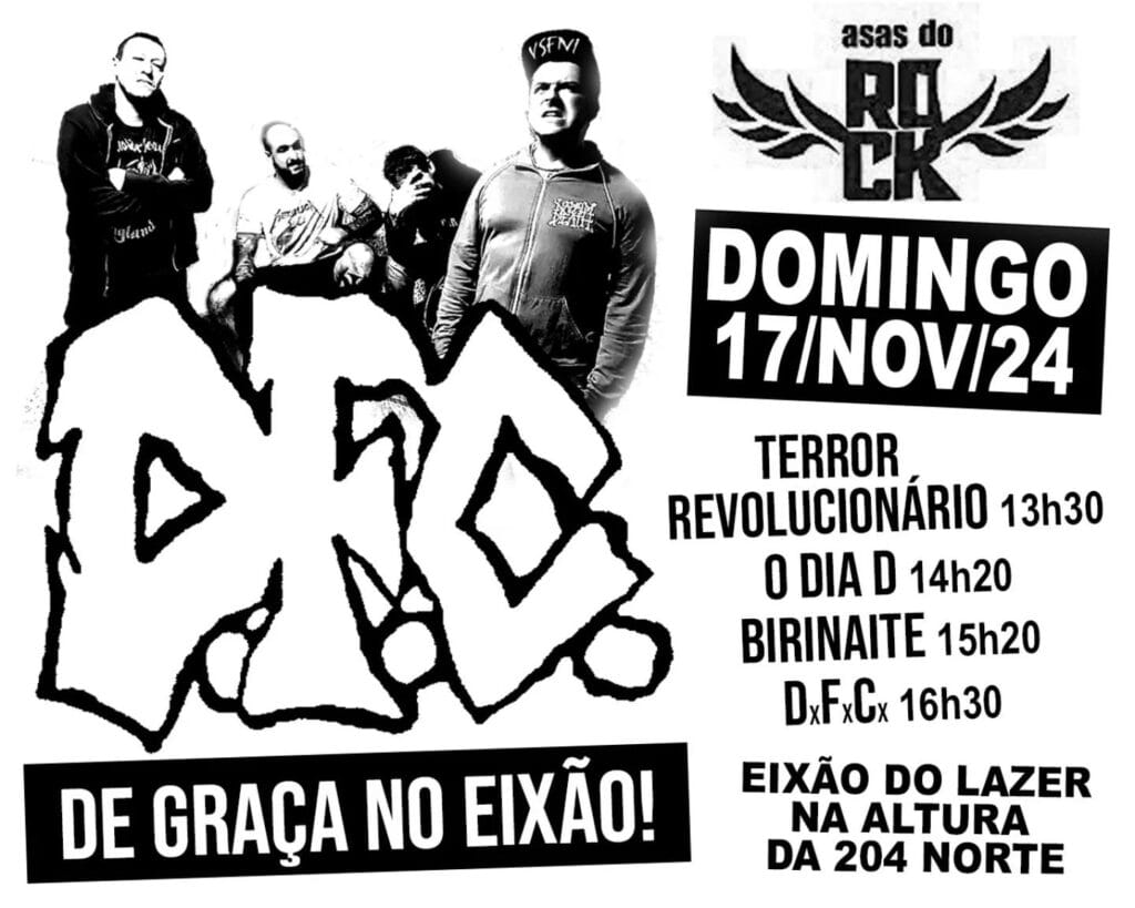 DFC de Graça no Eixão! Prepare-se para um domingo de puro rock no Asas do Rock. A banda brasiliense DFC é a grande atração, mas o evento também conta com outras feras do Underground como Warside, Mota, Terror Revolucionário, O Dia D e Birinaite. E o melhor de tudo? A entrada é gratuita!