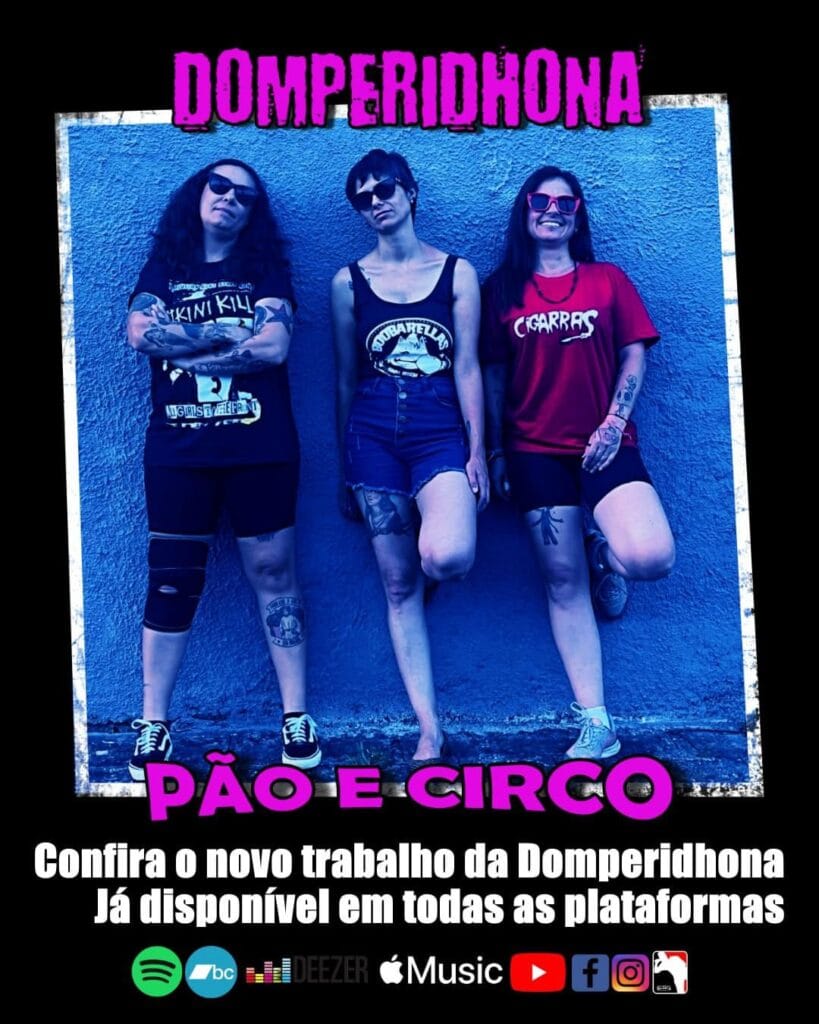 Diretamente da efervescente cena punk de Curitiba, o power trio Domperidhona acaba de apresentar ao mundo o seu mais recente trabalho: o EP “Pão e Circo”. Formado pelas talentosas Bia no baixo e vocal, Ana na guitarra e Carol na bateria, a banda presenteia seus fãs com um segundo lançamento carregado de energia e atitude.