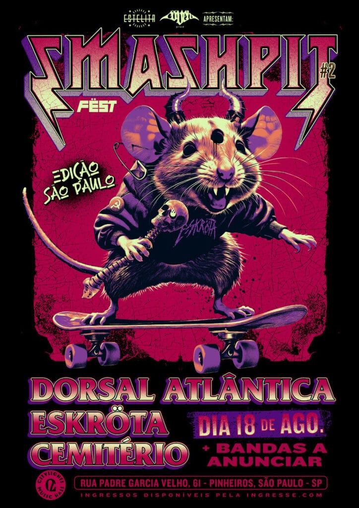 “Ano passado trouxemos o Mukeka Di Rato (ES) e o D.F.C (DF) e esse ano estamos trazendo o Dorsal como headliner em sua única apresentação em São Paulo neste ano, além do Ratos de Porão como headliner em Campinas (sábado, 17 de agosto)”, revelou Yasmin Amaral, idealizadora do evento e integrante da Eskröta, que também é uma das atrações do festival. “O Smashpit Fëst, feito em parceria com o produtor recifense João Soares, nasceu do sonho de ter um festival que fosse a minha cara, para poder dar stage dive em paz, entrar no mosh tranquila e ainda tocar com bandas que admiro”, acrescentou.