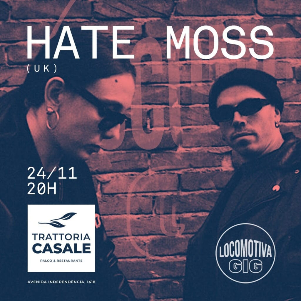 Nesta sexta-feira, 24 de novembro, às 20h, o duo ítalo-brasileiro Hate Moss, que faz um som experimental unindo punk, eletrônico e rock alternativo, retorna a Piracicaba para uma apresentação especial na Trattoria Casale Palco & Restaurante (avenida Independência, 1418). A apresentação é dentro do Locomotiva Gig, um projeto do Locomotiva Festival.