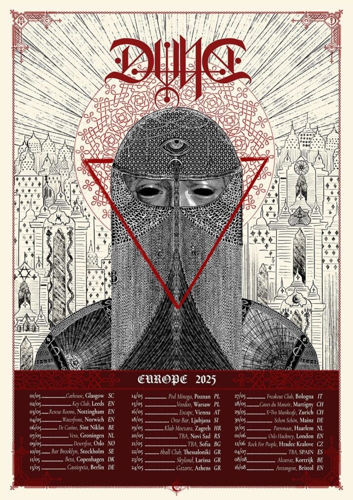 Formado em Edimburgo em 2013 pelo francês Victor Vicart e pelo escocês nativo Dudley Tait, o DVNE vem construindo uma poderosa cabeça de vapor desde seu segundo álbum, o caleidoscopicamente hipnotizante Etemen Ænka de 2021, seu primeiro lançamento pelo lendário selo Metal Blade Records e uma caminhada concertada até o mastro oleoso para esta roupa enigmática. O disco finalmente permitiu que o DVNE embarcasse em turnês como atração principal no Reino Unido e na Europa e ganhasse lugares em festivais exigentes como Hellfest , ArcTanGent , Desertfest , Damnation e Resurrection . Um EP ao vivo de músicas de álbuns reinventadas, Cycles Of Asphodel de 2022, manteve seu perfil enquanto saciava a demanda de uma base de fãs em rápido crescimento, e agora em 2024, o impressionante terceiro álbum Voidkind parece pronto para impulsionar esta formação expandida de cinco peças (dando as boas-vindas a Maxime Keller nos teclados) ao topo de seu jogo.