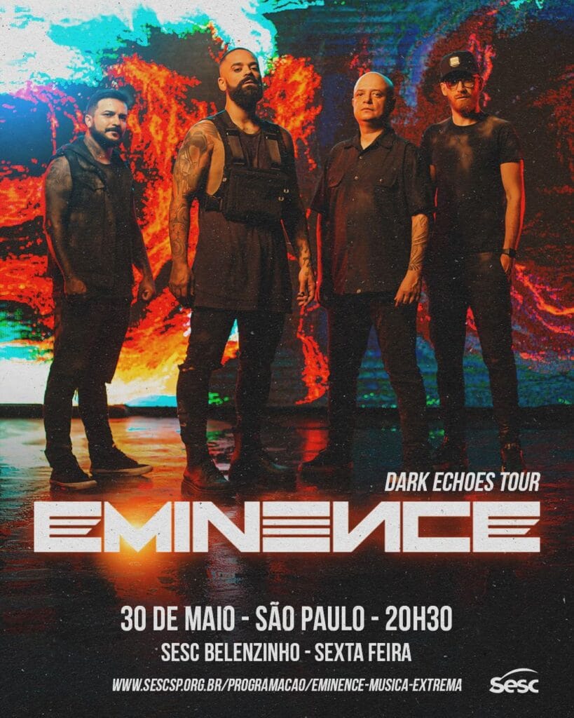 A banda mineira de metalcore Eminence, que conta com Bruno Paraguay (vocal), Alan Wallace (guitarra), Davidson Mainart (baixo) e Alexandre Oliveira (bateria, The Troops of Doom), que segue rodando o mundo com a nova turnê, “Dark Still Echoes”, estará em São Paulo para um show especial no SESC Belenzinho. O evento ocorre no dia 30 de maio (sexta-feira), às 20h30, e os ingressos antecipados online estão à venda – limite de dois (02) ingressos por pessoa.