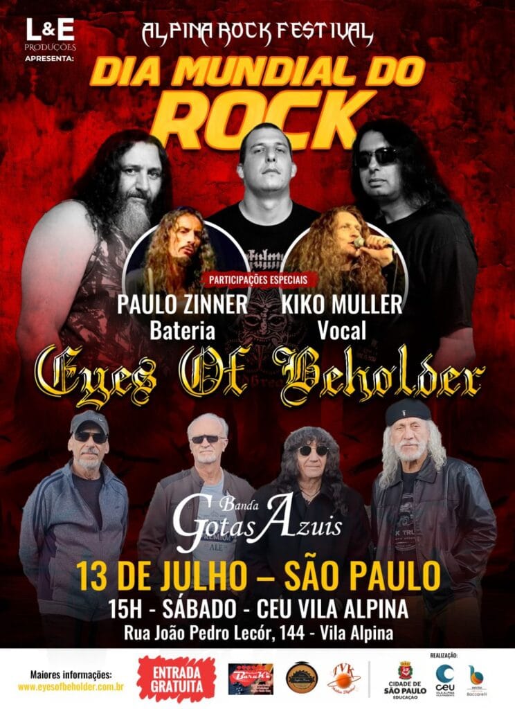 No sábado, 13 de julho, prepare-se para uma noite que entrará para a história do rock paulista! Celebrando o Dia Mundial do Rock, a banda Eyes of Beholder fará uma apresentação épica no CÉU Vila Alpina. Com entrada franca, o evento promete agitar a Vila Alpina a partir das 15h, reunindo fãs de todas as idades para uma celebração única e eletrizante.