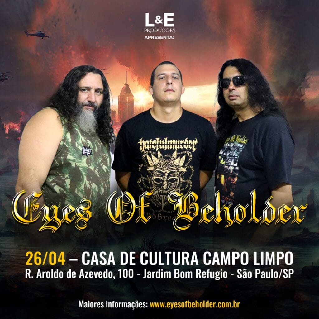 Na sexta-feira (26/04), o EYES OF BEHOLDER dirige-se para o bairro Jardim Bom Refúgio, onde se apresenta na Casa de Cultura Campo Limpo. Desta vez, a evento terá início às 16 horas. Veja o cartaz e informações completas abaixo: