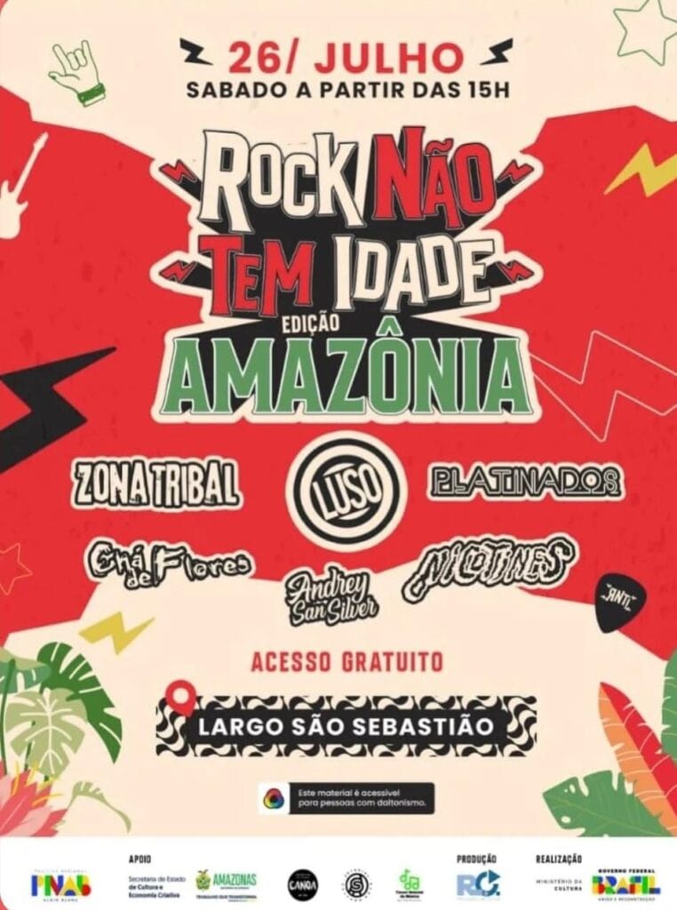 Rock Não Tem Idade – Edição Amazônia é um projeto aprovado no Edital PNAB 2024 – Política Nacional Aldir Blanc de Fomento à Cultura – e realizado com o apoio do Governo do Estado/ Conselho Estadual de Cultura/ Secretaria de Estado de Cultura e Economia Criativa, bem como do Governo Federal.