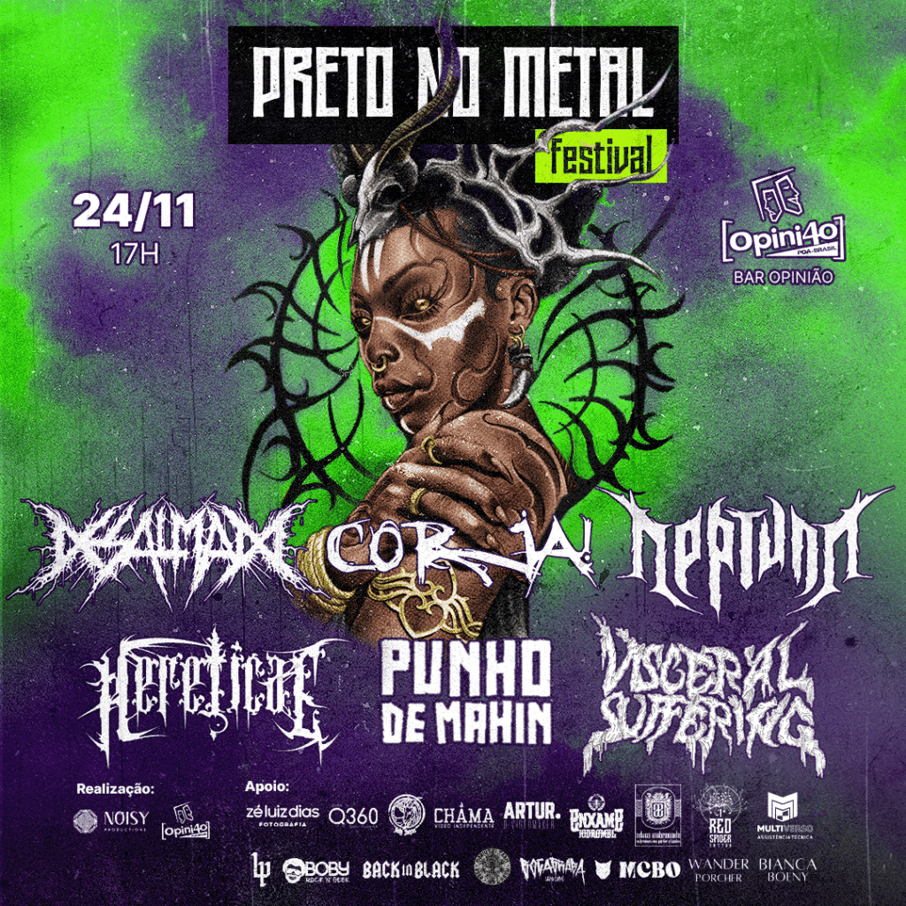Um espaço para promover e incentivar o diálogo sobre a representatividade do negro no heavy metal, o coletivo Preto no Metal/Coletivo Livre de Porto Alegre mostra a realidade atual da participação do público no cenário musical com o segundo festival do Preto no Metal, dia 24 de novembro. O Opinião receberá seis bandas marcando o Mês da Consciência Negra. São elas: Visceral Suffering, Hereticae, Neptunn, Corja, Punho de Mahin e Desalmado.