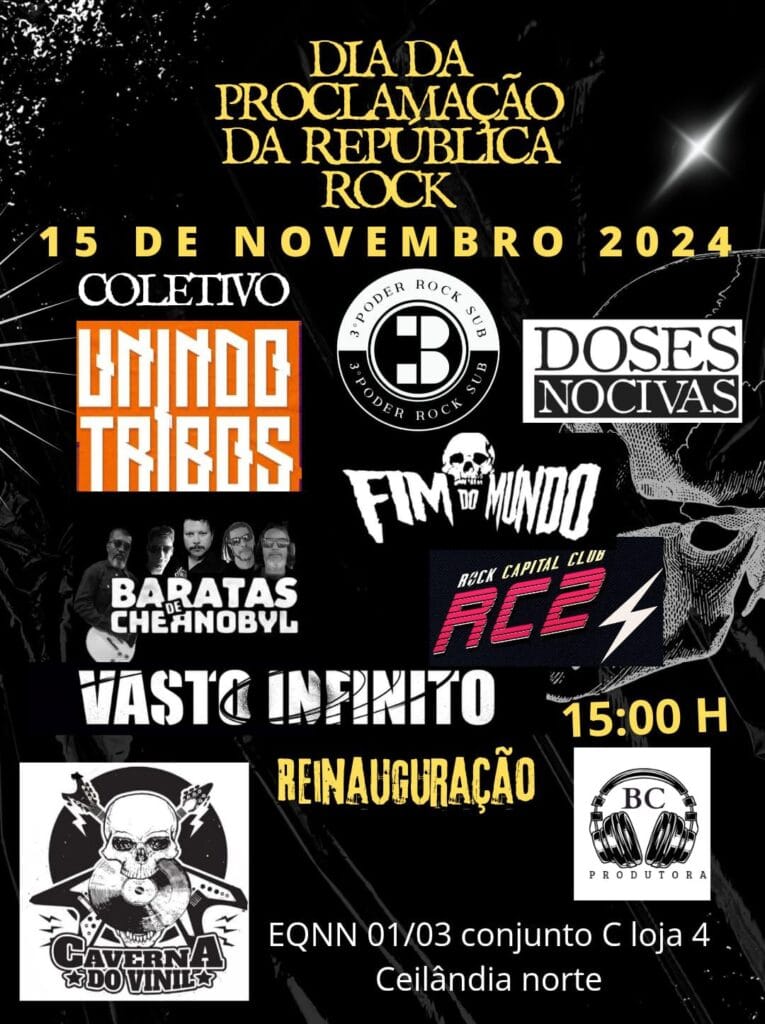 Em outras notícias, o FIM DO MUNDO já se prepara para mais um grande show nesta sexta-feira (15/11), no evento Dia Da Proclamação da República Rock. O festival acontece a partir das 15h no Caverna do Vinil Rock Bar, em Ceilândia/DF, e contará também com apresentações das bandas Rock Capital Club, Doses Nocivas, Baratas de Chernobyl e 3° Poder Rock Sub. Confira abaixo o cartaz e o serviço completo para mais informações: