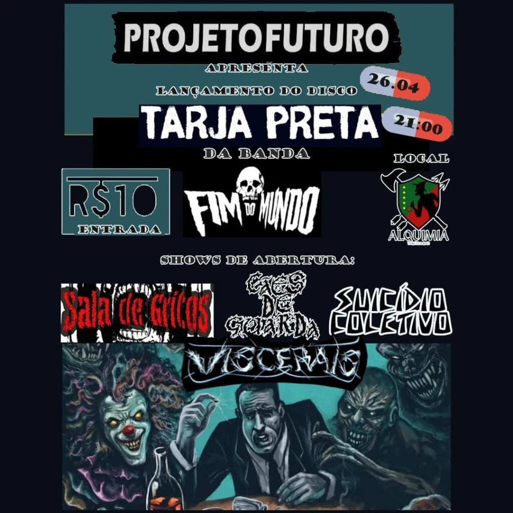 Em outras notícias, o FIM DO MUNDO já tem data marcada para o show oficial de lançamento do álbum “Tarja Preta”. A banda estará nesta sexta-feira (26/04), ao lado de Sala de Gritos, Cães de Guarda, Suicídio Coletivo e Viscerais no Alquimia Taberna Bar em Brasília/DF. Veja o cartaz e informações completas abaixo: