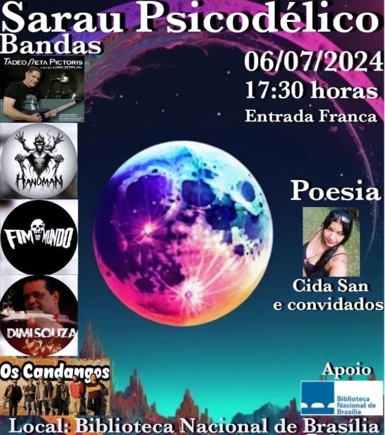 Outro importante evento que contará com a turnê de divulgação de “Tarja Preta”, será o ‘Sarau Psicodélico’, onde no dia 06/07/2024, o FIM DO MUNDO dividirá palco com Tadeo Beta Pictoris (acompanhado de sua banda Lord Zepplon), Handman, Dimi Souza, Os Candangos, além da poetisa Cida San. Confira: