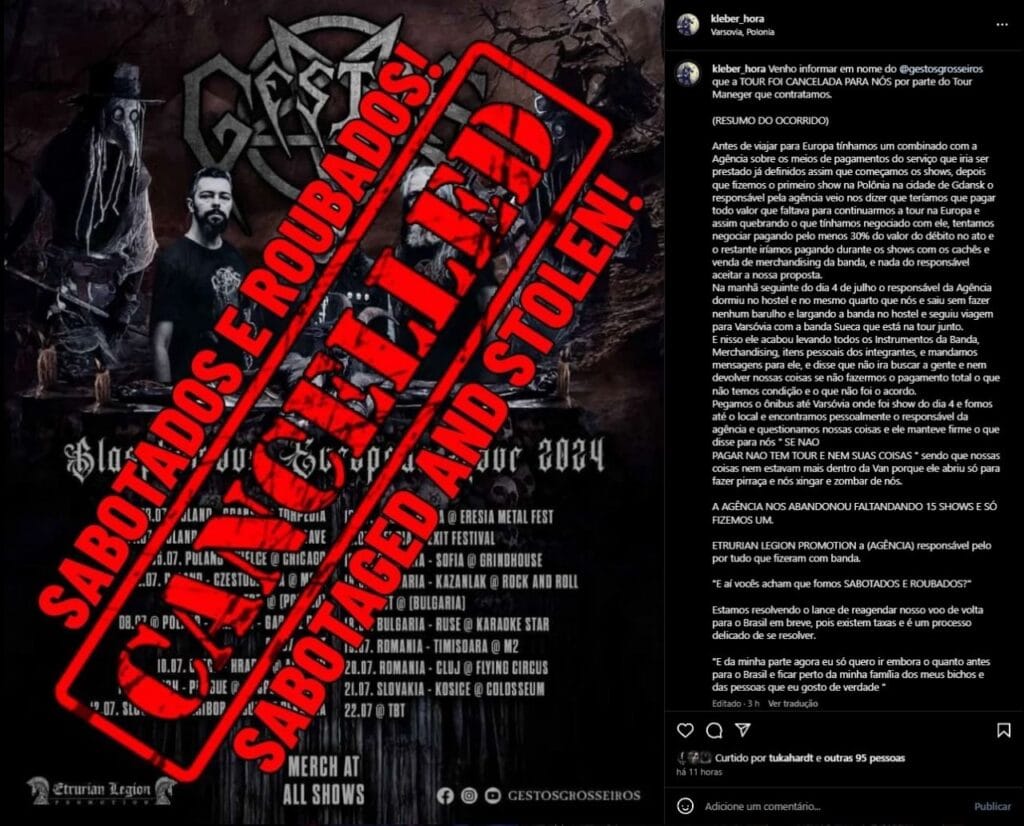 Segundo o músico, “a produtora Etrurian Legion Promotion simplesmente abandonou o trio no hostel em que estavam o primeiro show, feito no dia 04/07, levando todos seus instrumentos e merchandising alegando falta de pagamento”, porém ainda em nota a banda afirma que “50% do valor já havia sido pago, 30% seria adiantado após esta primeira apresentação e o restante seria acertado no decorrer da turnê, porém o produtor não aceitou”. Confira a nota completa AQUI: