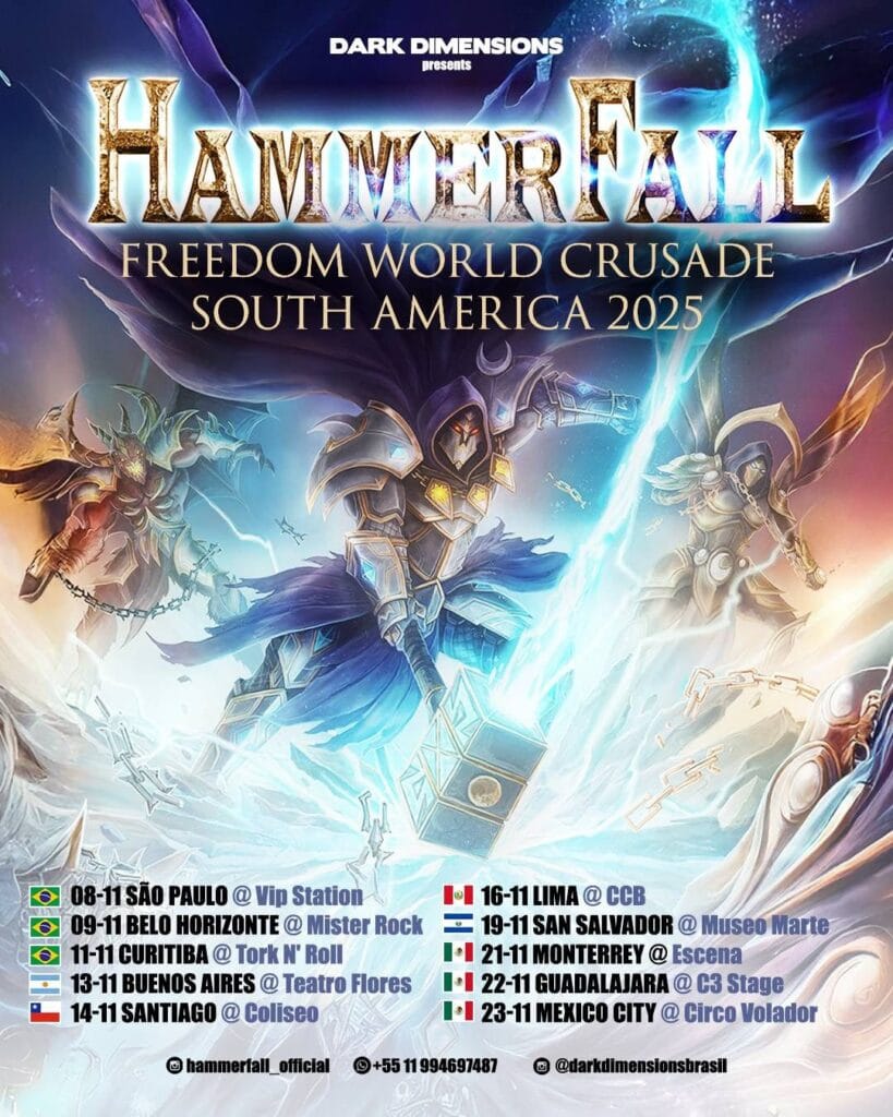 A produtora Dark Dimensions confirma o retorno do lendário HammerFall à América Latina com a turnê Freedom World Crusade South America 2025, trazendo toda a força épica e melódica que consagrou a banda sueca como um dos maiores nomes do Heavy/Power Metal mundial. No Brasil, o grupo fará três apresentações imperdíveis: