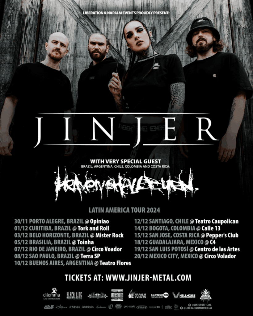 A Liberation Music Company & Napalm Events orgulhosamente anunciam o retorno à América Latina entre fim de novembro e dezembro de 2024 da banda ucraniana Jinjer com seu metalcore progressivo e repleto de nuances e atmosferas. Como convidados especiais em todos os shows da turnê, com a exceção do México, estão os pesos pesados do Heaven Shall Burn, uma das mais consagradas e talentosas formações do melodic death metal/metalcore em todo o mundo.