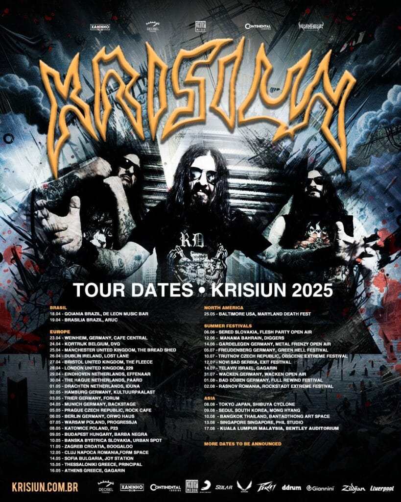 O calendário completo será anunciado nas próximas semanas, mas o Krisiun já tem importantes datas confirmadas neste novo giro a partir de 2025, como nos festivais Wacken Open Air, Maryland Deathfest, Obscene Extreme Festival e 70000 Tons of Metal.