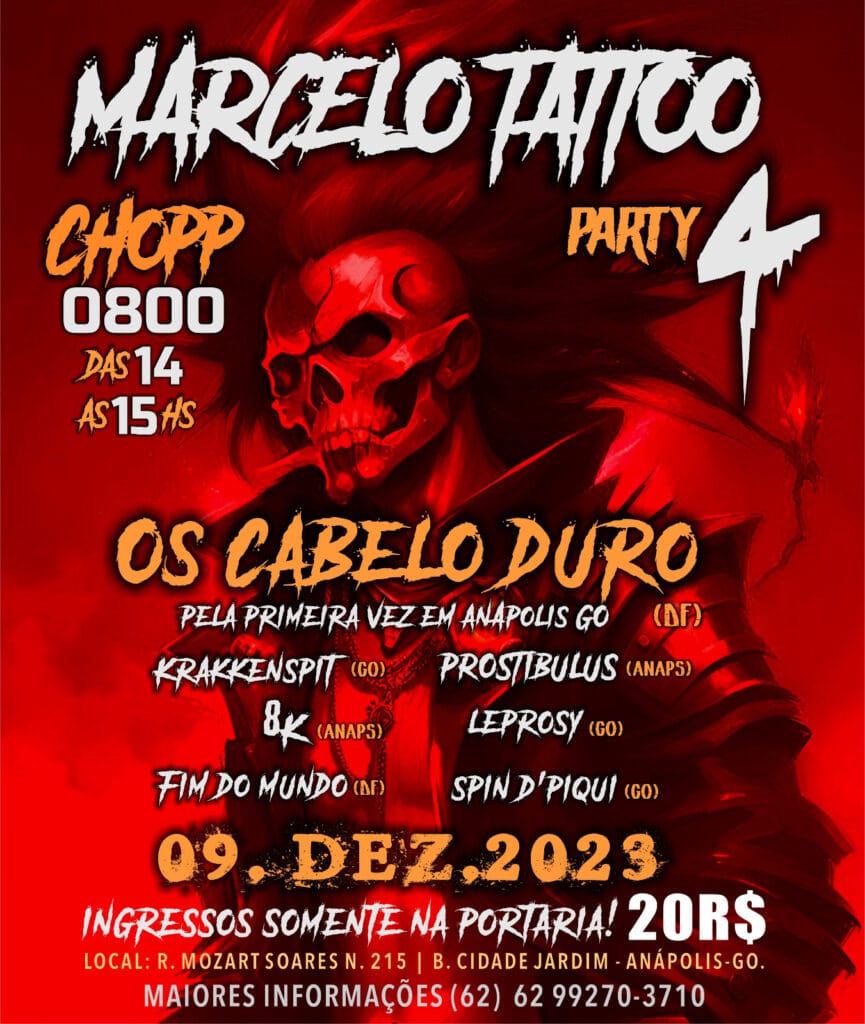 E para celebrar em grande estilo este acontecimento, o LEPROSY anunciou que estará promovendo a distribuição deste single ao vivo a quarta edição do ‘Marcelo Tattoo Party’, que acontece no mesmo dia do lançamento na cidade de Anapolis/GO e contará também com Fim do Mundo, 8K, Krakkenspit, Prostibulus e os brasilienses do Os Cabelo Duro. Confira abaixo o cartaz e serviço completo para mais informações: