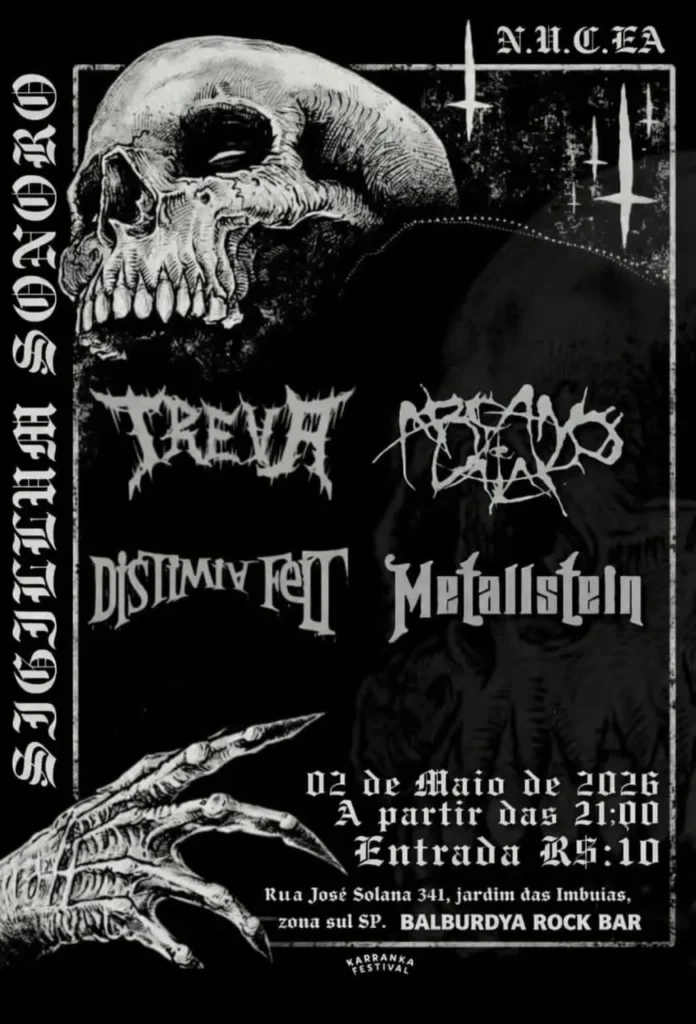 Ao lado de Distimia Felt, Treva e Arcano de Valak, o duo santista reafirma sua presença na celebração do Metal extremo no underground paulistano. Os ingressos para o evento seguem com o valor acessível de R$ 10,00, mantendo a proposta de fomento à cena independente. Confira abaixo o cartaz e serviço completo para mais informações: