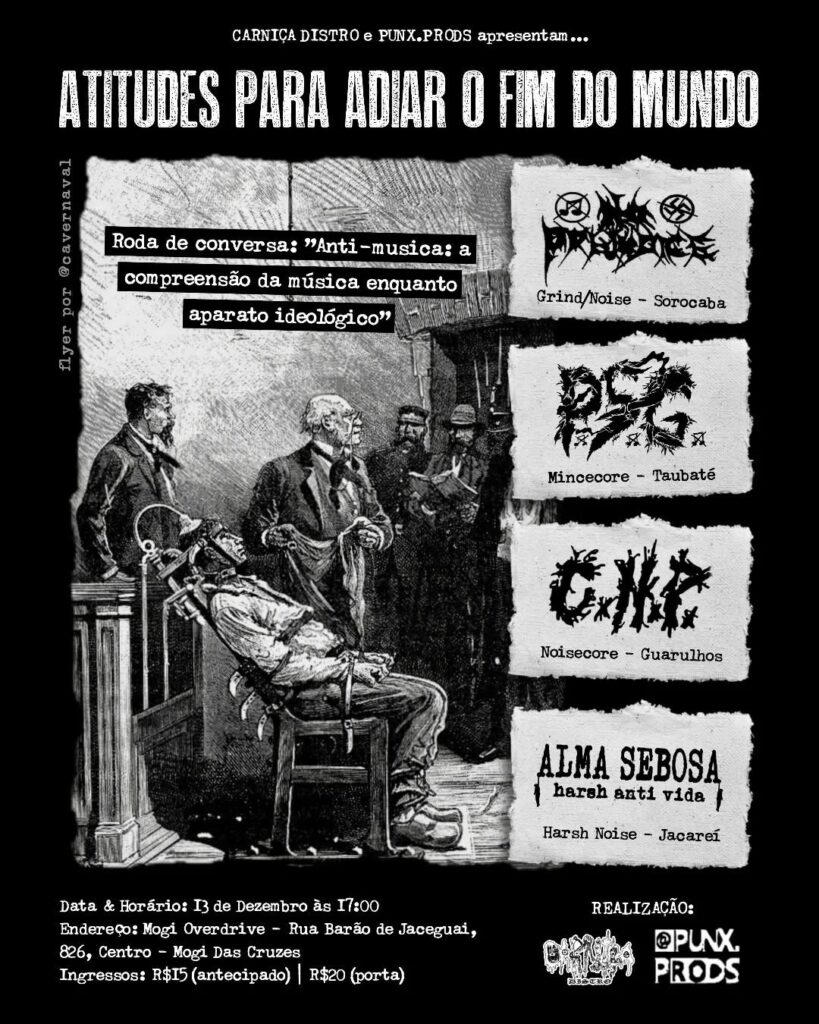 O dia 13 de dezembro promete ser uma data de intenso caos sonoro em Mogi das Cruzes. O festival “ATITUDES PARA ADIAR O FIM DO MUNDO”, organizado pela Carniça Distro (@carnicadistro) e Punx Prods (@punx.prods), está confirmado para ser um verdadeiro atentado contra os padrões musicais, com muito grindcore e noisecore, além de uma profunda reflexão sobre o papel da música no underground.