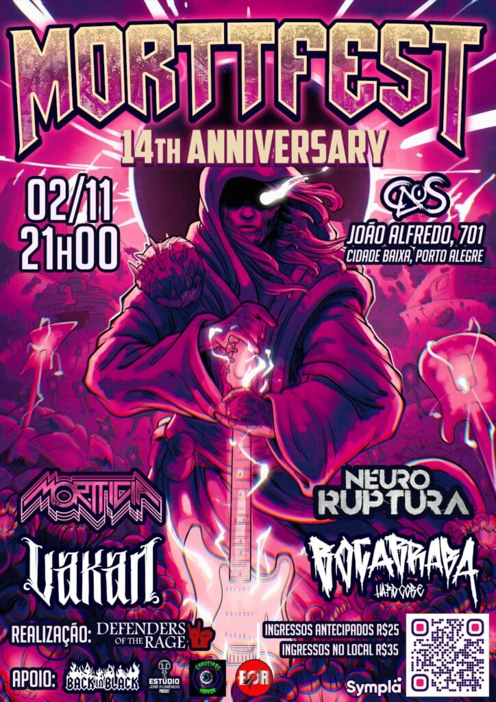 O MorttFest retorna em mais uma edição especial, comemorando os 14 anos de Mortticia e se consolidando como um dos eventos de destaque na cena rock e heavy metal de Porto Alegre. Idealizado e produzido pela banda, o festival tem como objetivo reunir e valorizar bandas parceiras que se destacam pela produção de música de alta qualidade no cenário do metal gaúcho e do sul do Brasil.