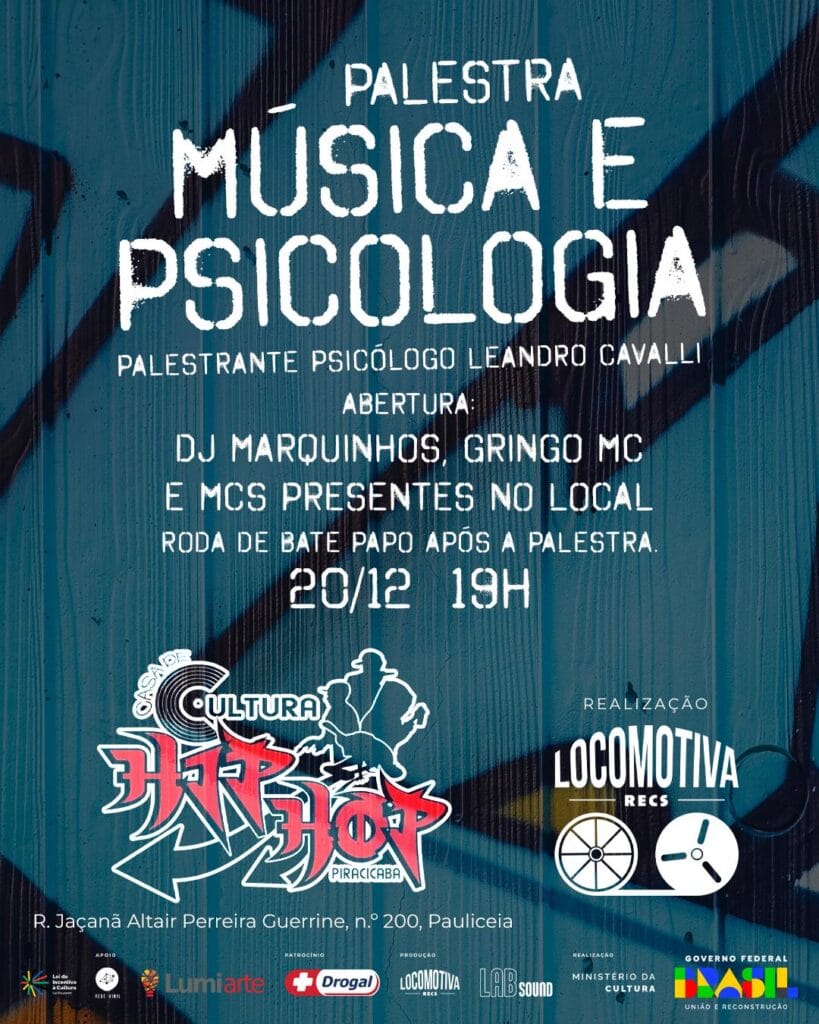 Palestra ‘Música e Psicologia’, com psicólogo Leandro Queiroz Cavalli, nesta quarta-feira, 20 de dezembro, às 19h, na Casa do Hip Hop (@casahiphoppiracicaba). Rua Jaçanã Altair Perreira Guerrine, 200. Bairro Pauliceia. Entrada gratuita.