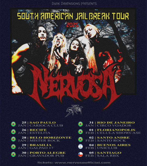 E ano de 2025 já começa intenso para Nervosa, tocando em casa; A turnê Sul Americana se iniciará em São Paulo, no dia 25 de janeiro, e se estende por Recife, Belo Horizonte, Brasilia, Porto Alegre, Rio de Janeiro, Florianópolis, Santo André, Buenos Aires (Argentina) e Santiago (Chile). Logo em seguida, a banda embarca para uma grande turnê na França, onde representarão o Brasil em um dos maiores (senão o maior) festivais de Metal do mundo, o Hellfest.