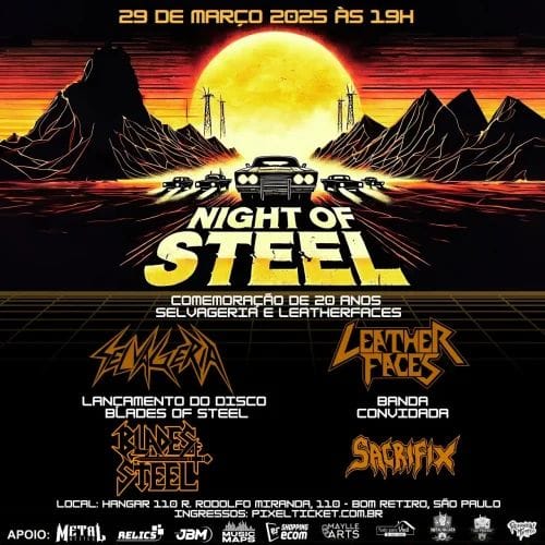 Atenção, headbangers! No dia 29 de março, o lendário Hangar 110 se tornará o palco de uma celebração épica do verdadeiro Heavy e Thrash Metal. O festival Night Of Steel reunirá quatro grandes bandas brasileiras que representam com orgulho a força do metal tradicional e do underground atual: Sacrifix, Blades Of Steel, Selvageria e Leatherfaces.