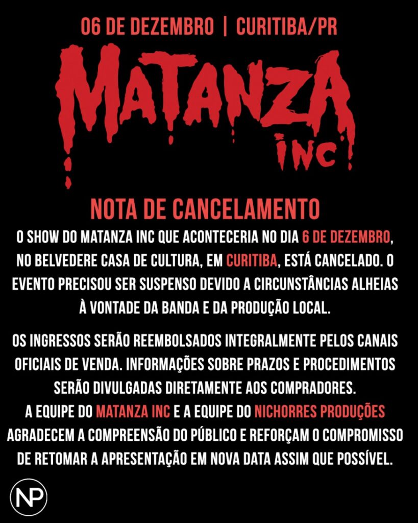 O show do Matanza Inc que aconteceria no dia 6 de dezembro, no Belvedere Casa de Cultura, em Curitiba, está cancelado. O evento precisou ser suspenso devido a circunstâncias alheias à vontade da banda e da produção local.