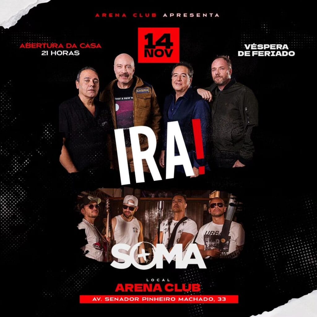 Na próxima terça-feira, dia 14 de novembro, a lendária banda brasileira Ira! estará incendiando o palco da Arena Club, em Santos. E para tornar essa noite ainda mais memorável, a banda Söma, novo nome do rock nacional, será a responsável por acender a pólvora, garantindo que a energia comece desde o início da noite.