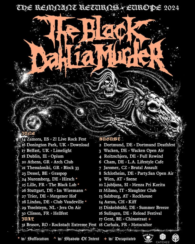 The Black Dahlia Murder retornará ao exterior neste verão para sua primeira turnê pela Europa desde 2019, incluindo apresentações em festivais como Party San , Download , Graspop , Brutal Assault , Summer Breeze e muito mais. O suporte para datas selecionadas vem de Suffocation , Shadow of Intent e Decapitated . Veja as datas e detalhes do suporte abaixo e adquira seus ingressos AQUI .