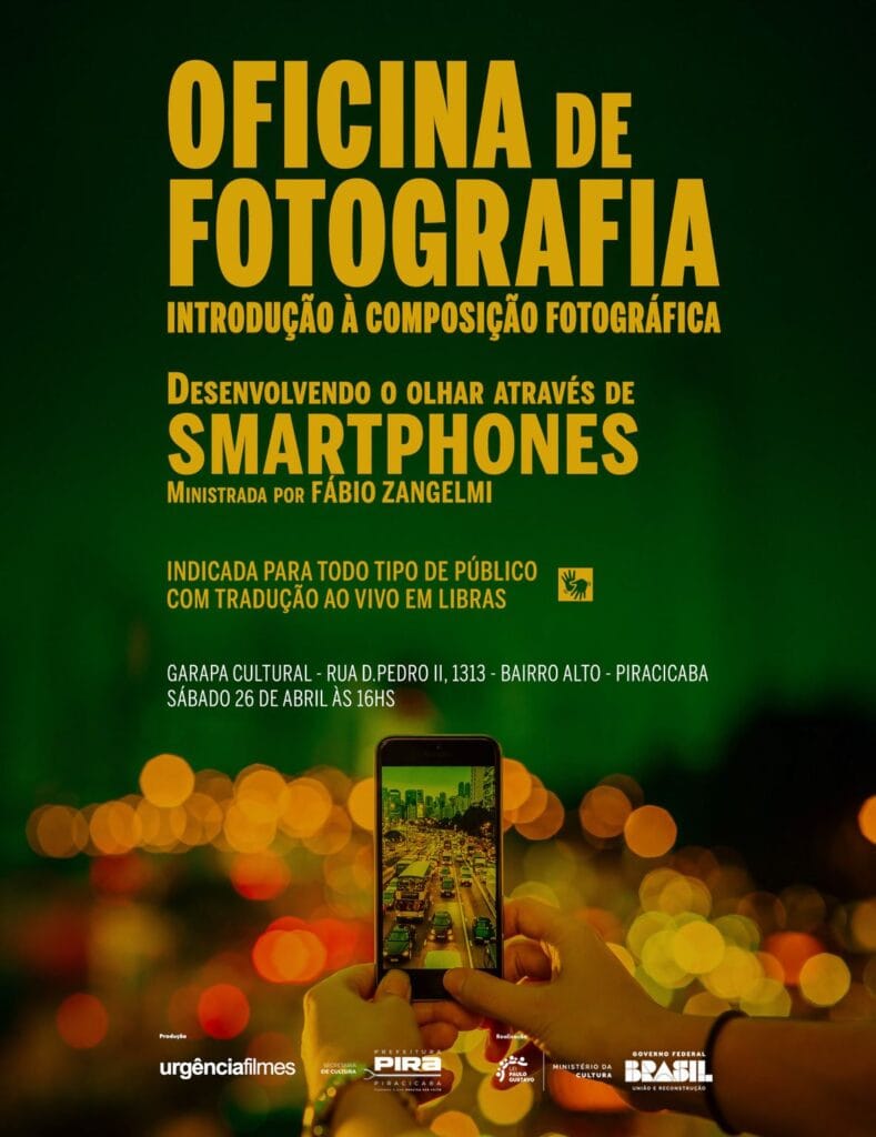 A produtora audiovisual Urgência Filmes promove neste sábado (26), em Piracicaba/SP, a Oficina de Fotografia: Introdução à Composição Fotográfica – Desenvolvendo o Olhar Através de Smartphones. A atividade acontece às 16h, no Garapa Arte e Cultura (rua Dom Pedro II, 1313, bairro Alto). A ação é ministrada pelo professor, fotógrafo e videomaker Fábio Zangelmi e a participação é gratuita.