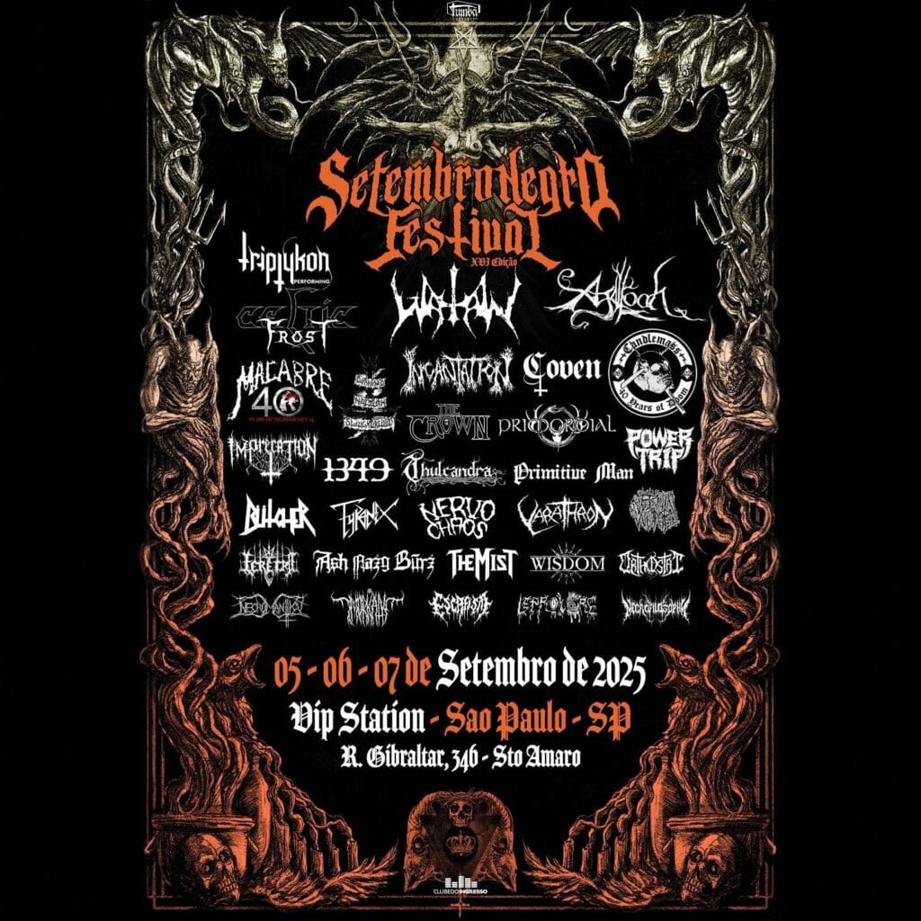 O line-up reúne 30 bandas de diferentes partes do mundo, incluindo lendas como Coven, Candlemass, Triptykon — com um set especial apresentando Celtic Frost —, Macabre, Incantation, Watain e Varathron. O cast também destaca nomes importantes do cenário nacional, como NervoChaos, The Mist, Necrofilosophy, Necromantticu e o quarteto catarinense ORTHOSTAT, que juntos representarão a força do Metal extremo produzido no Brasil. Confira abaixo o cartaz e o serviço completo para mais informações:
