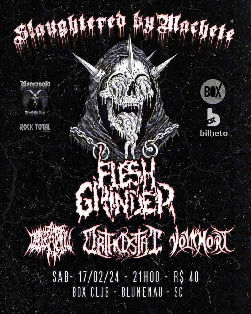Ingressos: R$ 30,00 (via PIX) – chave: necrovoid.productions@gmail.com | R$ 40,00 (online) – adquira aqui: https://www.bilheto.com.br/comprar/1964/slaughtered-by-machete