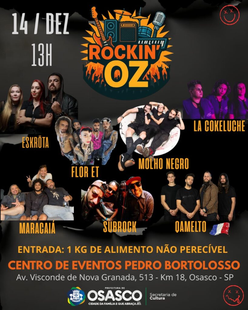 A Prefeitura de Osasco, através da Secretaria de Cultura, tem o prazer de anunciar o ROCKIN’ OZ, o evento que promete ser o último e maior festival de rock da cidade em 2025, celebrando a força da cena musical local e trazendo grandes nomes do cenário nacional e internacional. O festival, que carrega o espírito solidário, acontecerá no dia 14 de dezembro e terá entrada mediante a doação de 1kg de alimento não perecível.