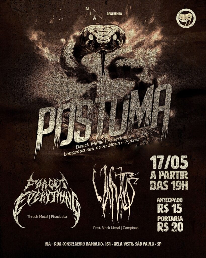 Para celebrar o lançamento de “Pythía”, a PÓSTUMA realiza seu primeiro show oficial da nova turnê neste sábado, 17 de maio, no Núcleo de Intervenções Artísticas (NIÁ), em São Paulo. O evento contará com as participações das bandas Forget Everything e Vantas.