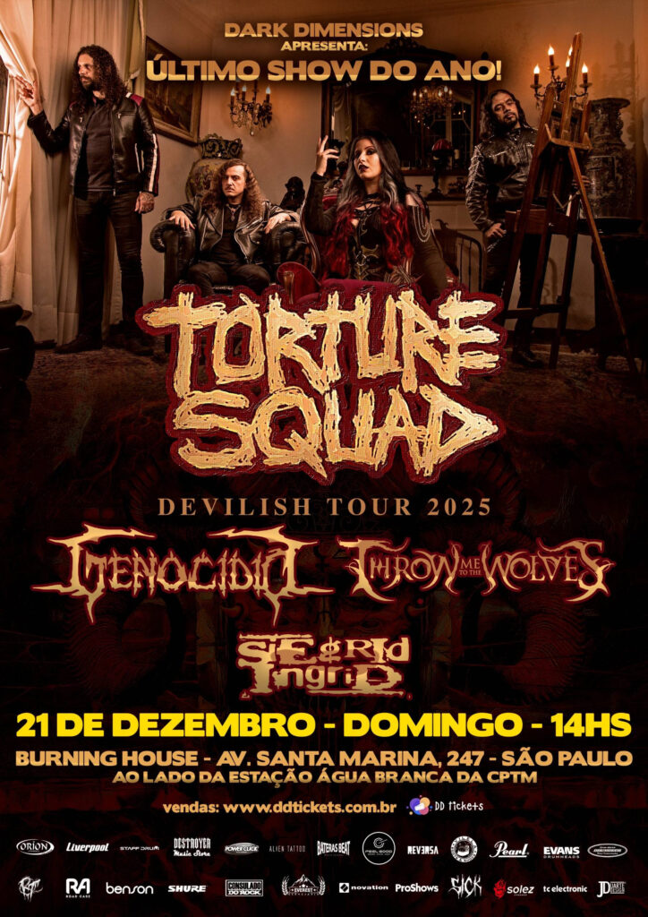 No dia 21 de dezembro, a produtora Dark Dimensions traz para a Burning House, em São Paulo, uma das noites mais pesadas e imperdíveis do ano, reunindo quatro forças absolutas do metal nacional: Torture Squad, Genocídio, Siegrid Ingrid e Throw Me To The Wolves.