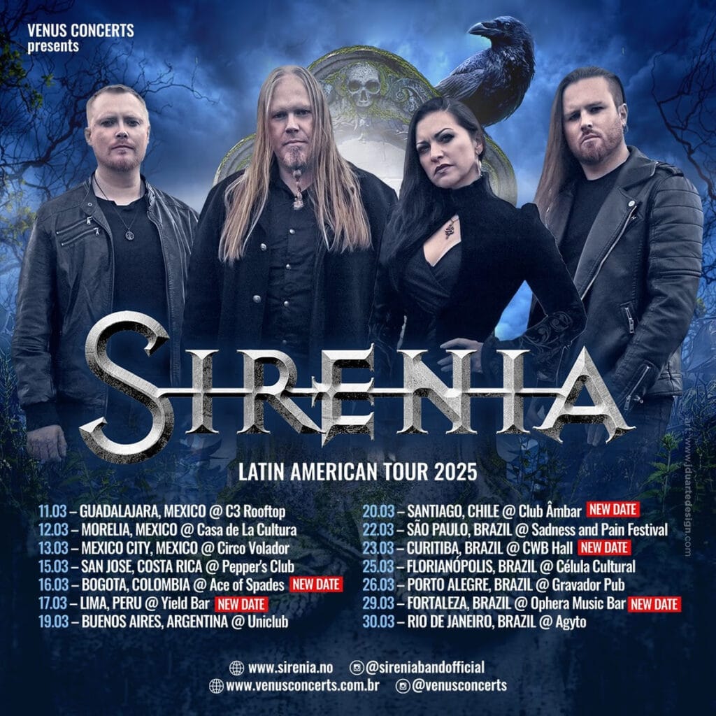 Banda do primeiro escalão mundial do metal sinfônico, os noruegueses do Sirenia desembarcam na América do Sul em março de 2025 para uma grande turnê de 14 shows, sendo 6 no Brasil. A turnê é uma realização da Vênus Concerts.